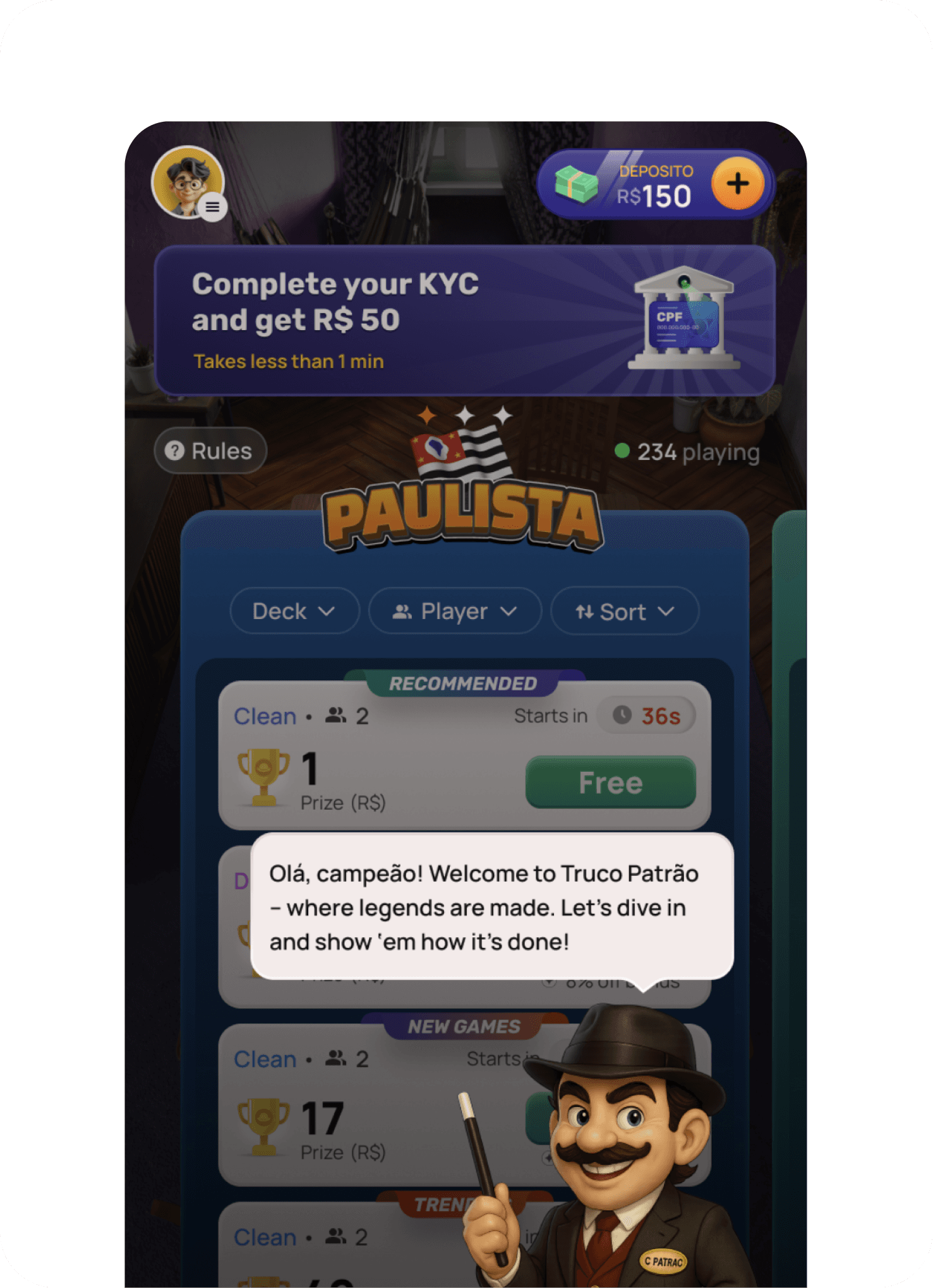 Truco is a culturally iconic Brazilian card game—loud, emotional, and rooted in childhood memories. We designed Truco as a real-money experience for skilled Tier 2–3 players, preserving the banter, bluffing, and intensity of offline play. Through expressive motion, casual visual language, and culturally authentic environments inspired by Brazilian homes and cafés, the game sets a new benchmark for digital Truco—balancing nostalgia with professional RMG design.